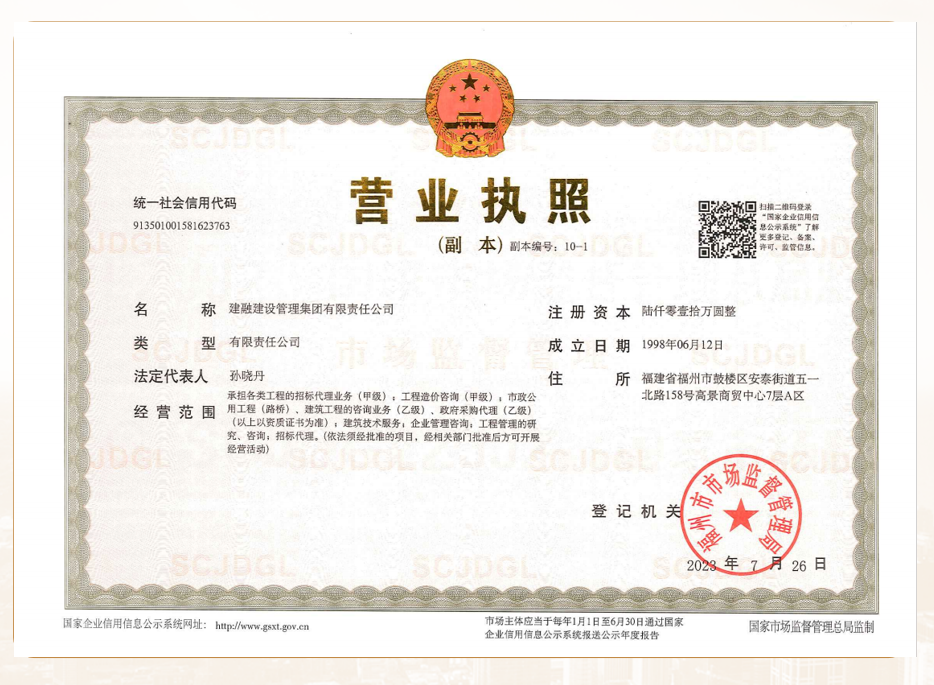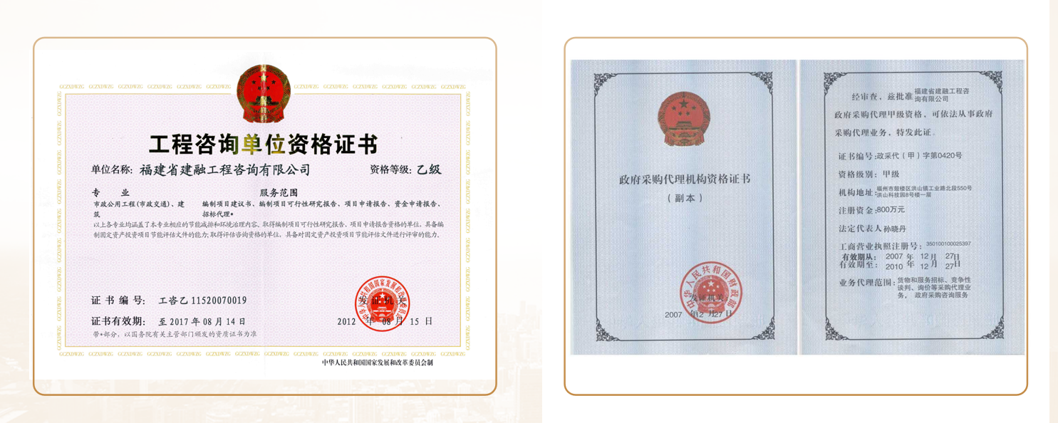 公司秉承“公平公正,服务社会;诚信为本,赢得信赖;优质高效,一丝不苟;锐意改革,紧跟时代”的服务宗旨。先后完成了高层民用建筑、大中型工业厂房、高级装饰装修工程、城市供水、污水处理及公路、桥梁、水利等一大批工程项目的可行性研究报告,以及工程咨询、招标代理、造价咨询、政府采购、工程项目全过程管理等业务。建融现有一级、二级分公司共有35个遍布福建省内及各地,如四川、重庆、西藏、江西、海南、甘肃、广东、天津等。建融公司将一如既往地贯彻“客观、公正、优质、高效”的经营原则,以精湛的技术、科学的管理、良好的信誉,竭诚为社会各界提供全方位、高质量的服务,为企业的持续发展奠定坚实的基础。