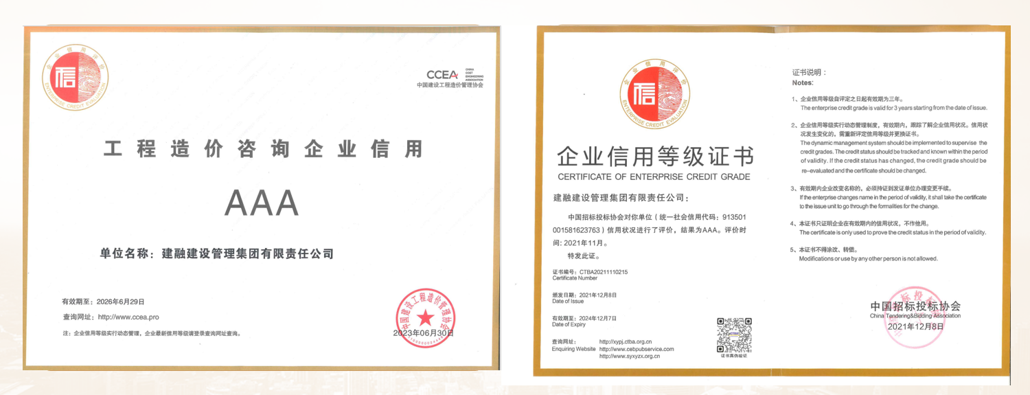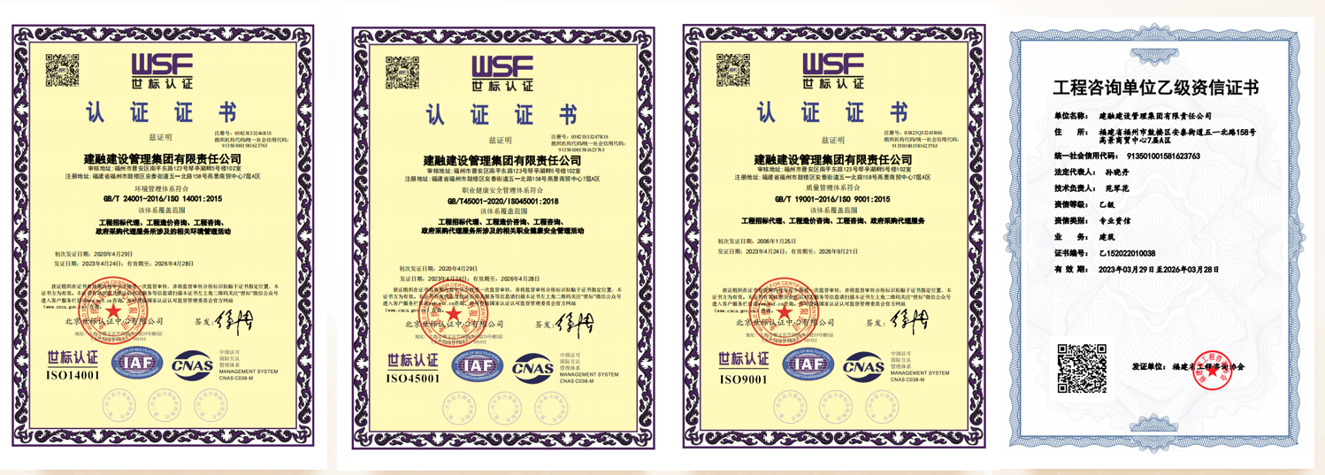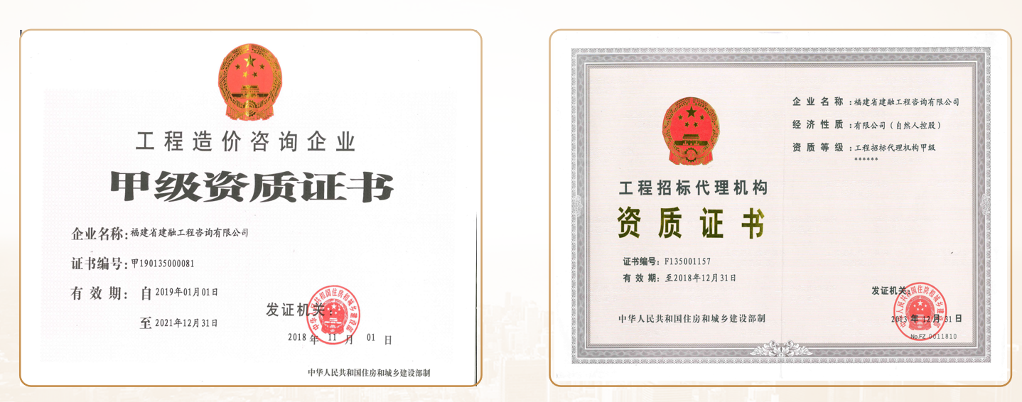 天博网页版登录界面(中国)官方网站前身为福建省建融工程咨询有限公司成立于199512月,是我省具有综合性质的建设工程咨询公司之一。公司已通过ISO9001质量管理体系、14001环境管理体系、45001职业健康管理体系认证,曾多次获得中国建设工程造价管理协会、中国招标投标协会颁发的AAA信用评价证书。现具有工程招标代理(甲级)、工程造价咨询(甲级)、政府采购(乙级)、工程咨询资信评定(乙级)、中央投资项目招标代理、建筑工程预算事务培训、工程项目管理、施工成本管理咨询、建筑司法纠纷咨询、行业实务培训服务等多项资质的综合性工程咨询公司。