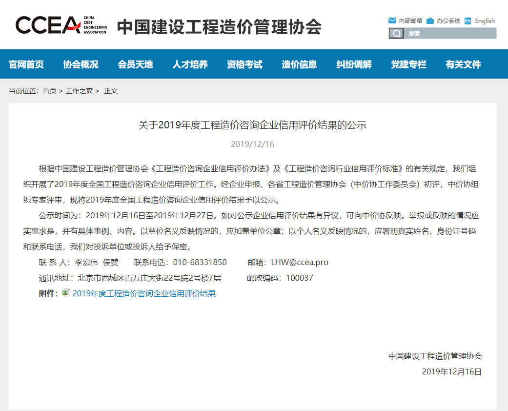 关于2019年度工程造价咨询企业信用评价结果的公示
