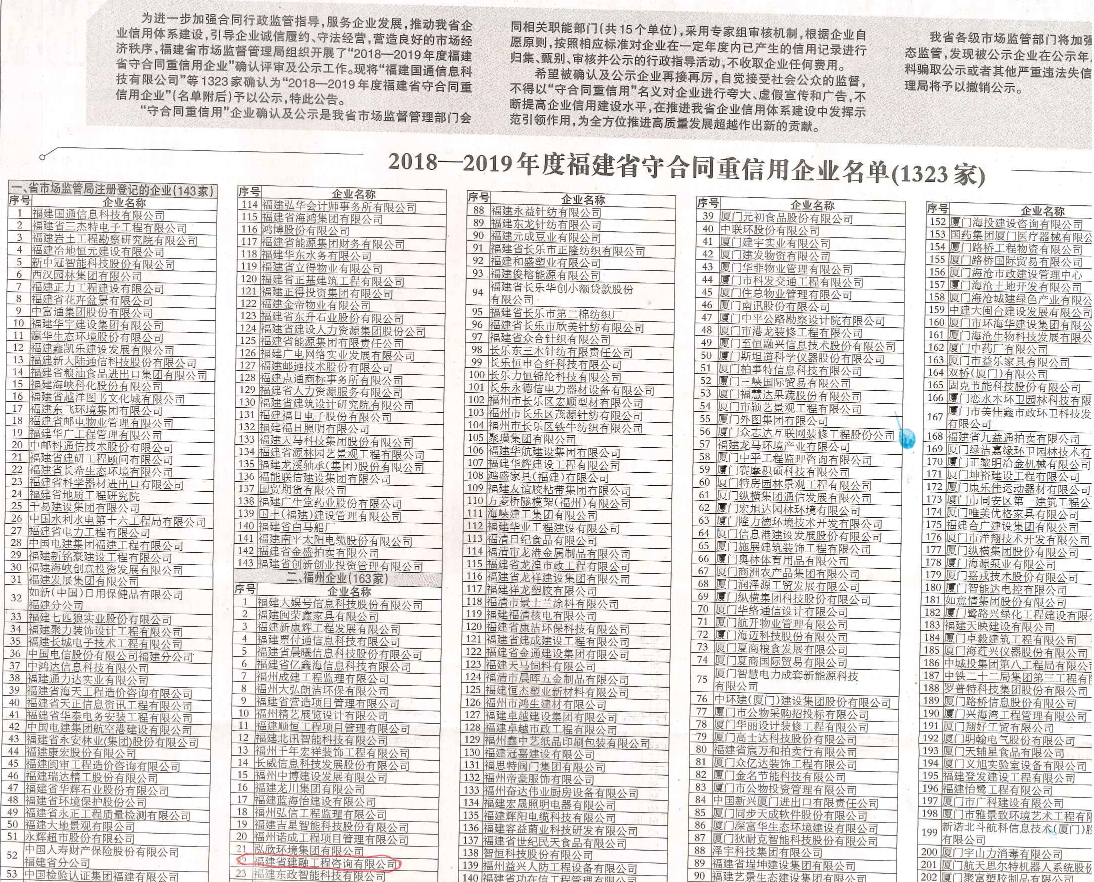 为进一步加强合同行政监管指导,服务企业发展,推动我省企业信用体系建设,引导企业诚信履约、守法经营,营造良好的市场经济秩序,福建省市场监督管理局组织开展了“2018—2019年度福建省守合同重信用企业”确认评审及公示工作。现将“福建国通信息科技有限公司”等1323家确认为“2018—2019年度福建省守合同重信用企业”(名单附后)予以公示,特此公告。